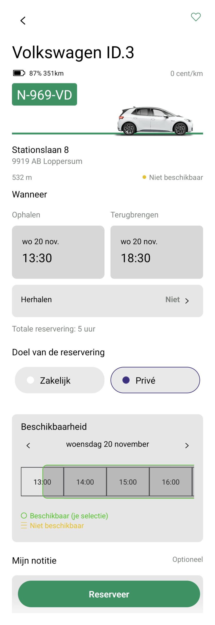 Controleer de reservering en klik op reserveren. Je ontvangt meteen een e-mail met een bevestiging. TIP: voordat de reservering ingaat, kun je deze nog wijzigen of annuleren. Als de reservering eenmaal is gestart kun je deze alleen nog maar beëindigen of verlengen (als de auto nog beschikbaar is.